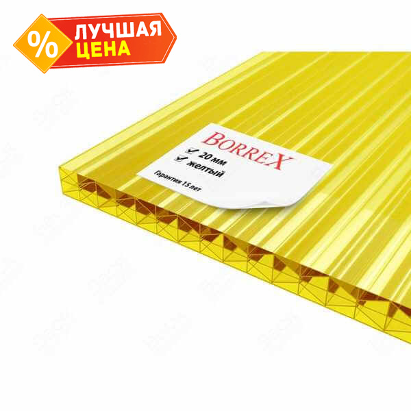 Сотовый поликарбонат 20 мм BORREX желтый 2100х6000 мм - это прочный и легкий материал, который отлично подходит для использования в различных строительных и дизайнерских проектах. Поликарбонат обладает высокой устойчивостью к ударным нагрузкам, а также хорошей теплоизоляцией и светопропусканием, что делает его идеальным выбором для создания светопрозрачных конструкций.
