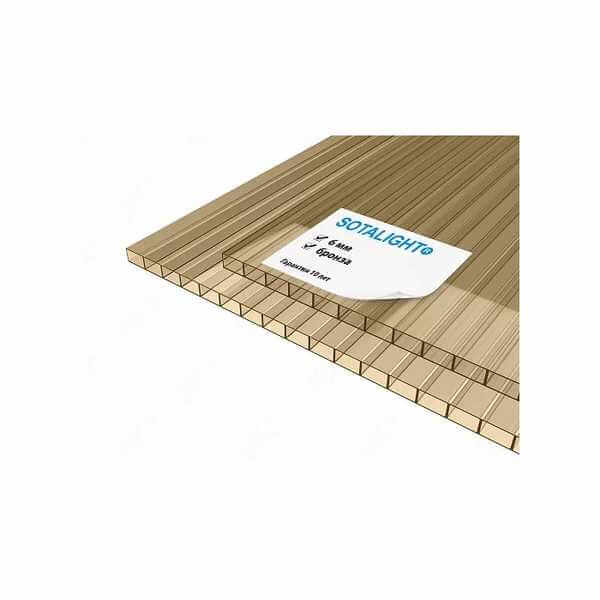 Сотовый поликарбонат 6 мм SOTALIGHT бронза 2100х6000 мм - это прочный и легкий материал, который отлично подходит для использования в различных строительных и дизайнерских проектах. Поликарбонат обладает высокой прочностью и устойчивостью к воздействию внешних факторов, что делает его идеальным выбором для создания крыш, навесов, ограждений и других конструкций.