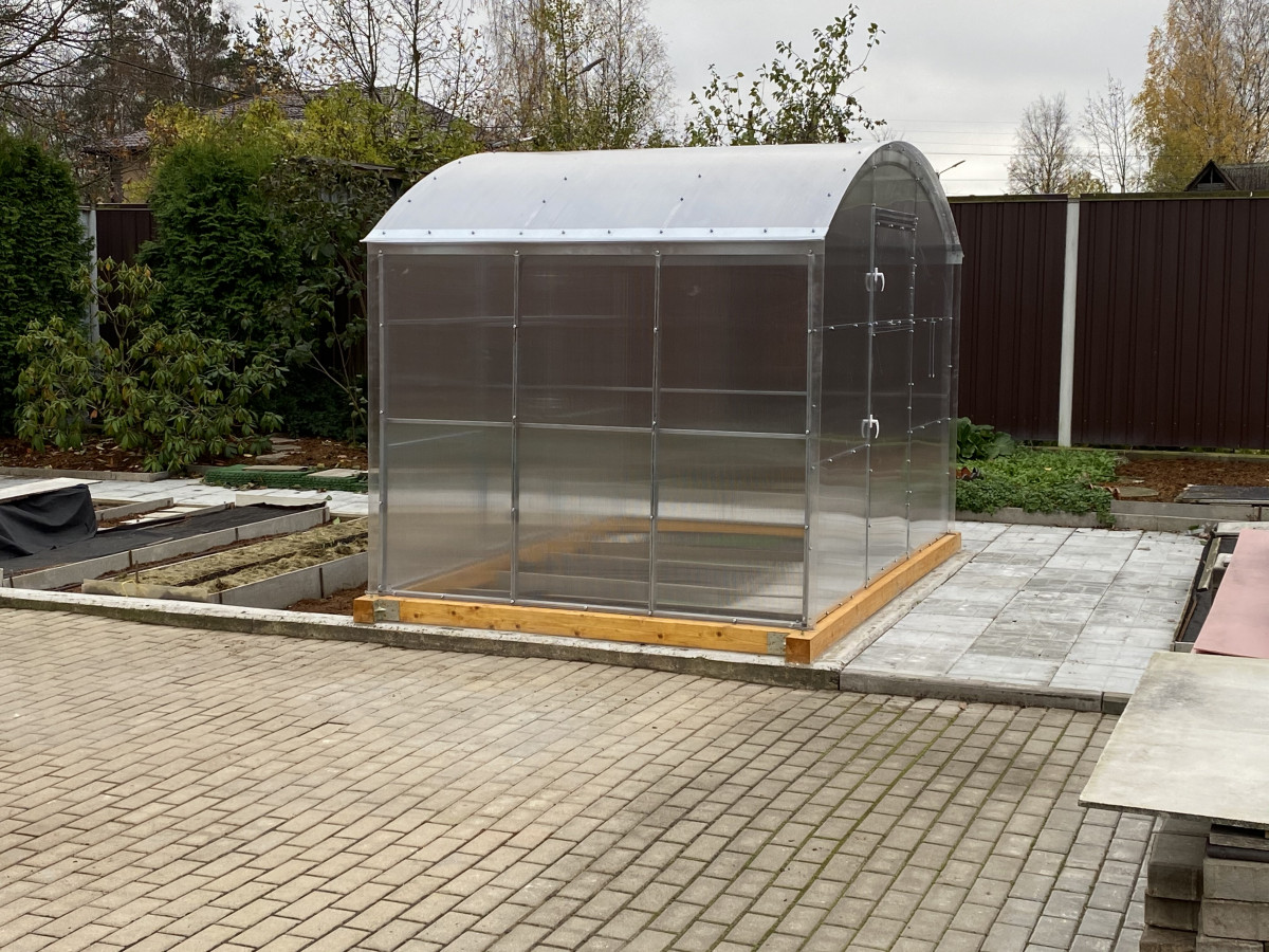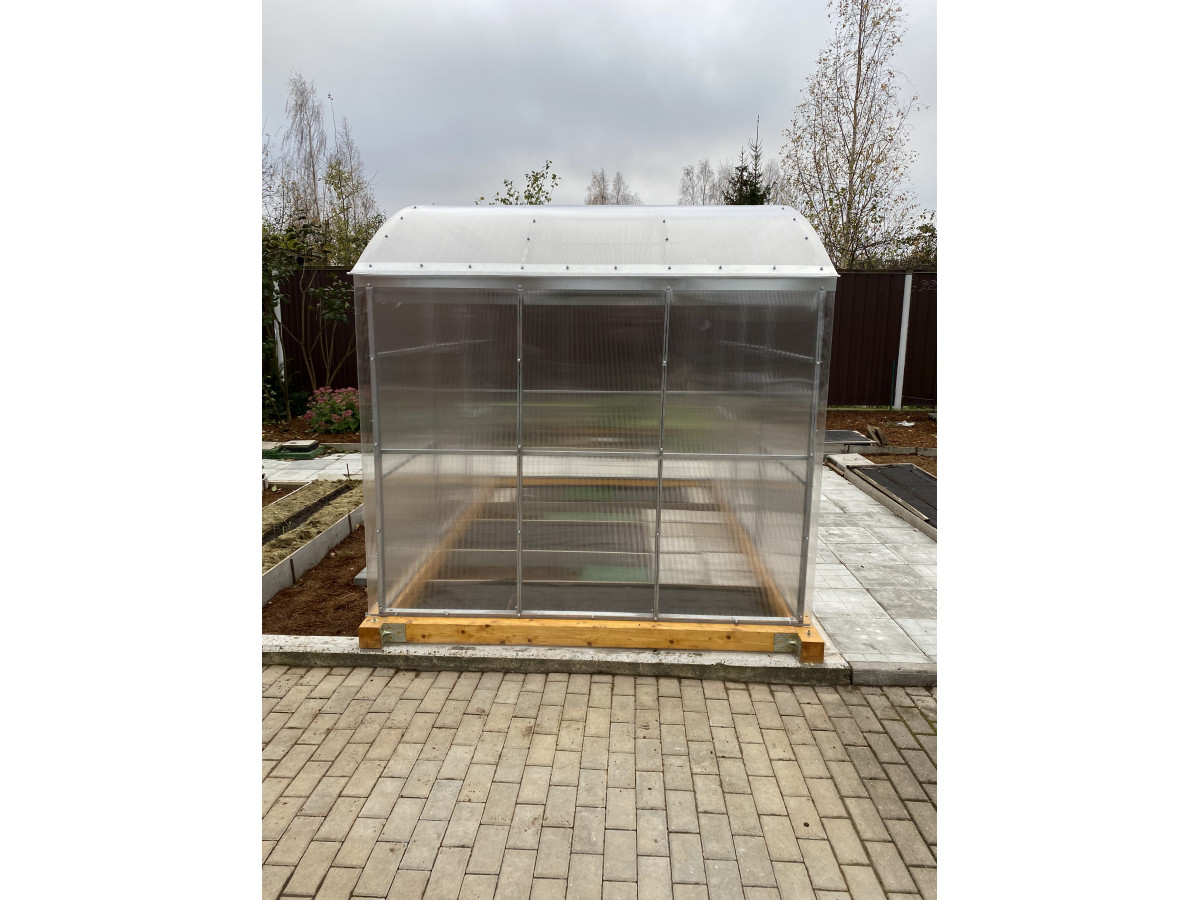 Возможна самостоятельная сборка по подробной инструкции. Сборка теплицы монтажниками-профессионалами компании занимает порядка 3 часов. В качестве основания рекомендуется использовать бетонный, либо деревянный фундамент из бруса. Предварительно брус необходимо обработать антисептиком. Полный комплект состоит из:
